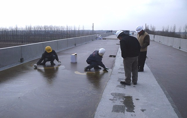 ③在第一遍防水涂料不粘手的情况下可涂刷第二道防水涂料,涂刷方向与第一遍要垂直。当涂膜固化完全,并经淋雨试验验收合格后,方可交工。